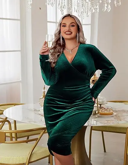 2026 Womens Plus Size Long Sleeve Velvet Asymmetrical Empire Waist Slim Fit Ruched Wrap V Neck Cocktail Party Dress